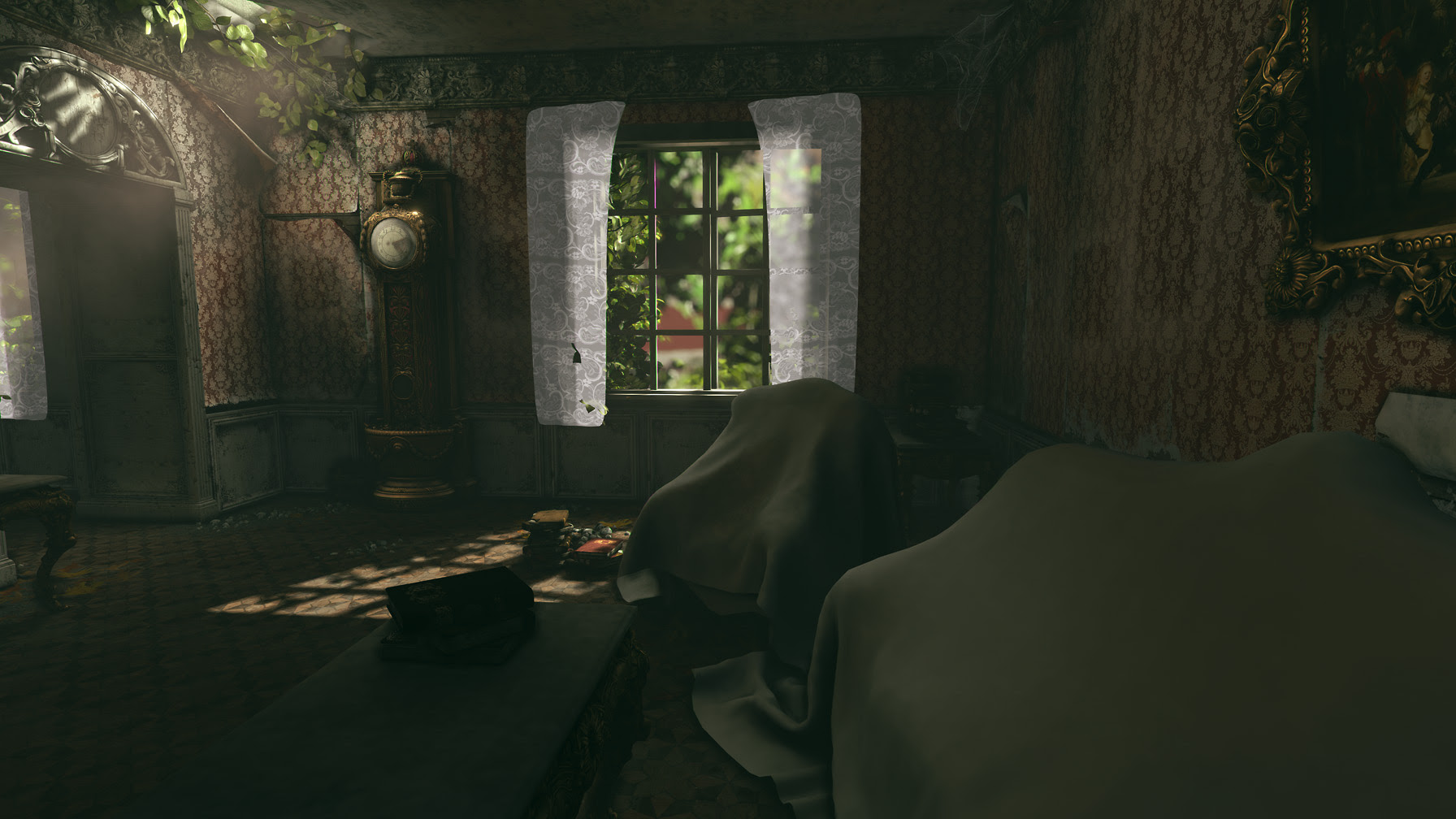 Made a small video of walking around the environment a bit, it's a bit more atmospheric than just still pictures :) Still plenty of placeholders to fix, like the ceiling, candelier, fireplace, windows, curtains... yeah, I got work to do ^^